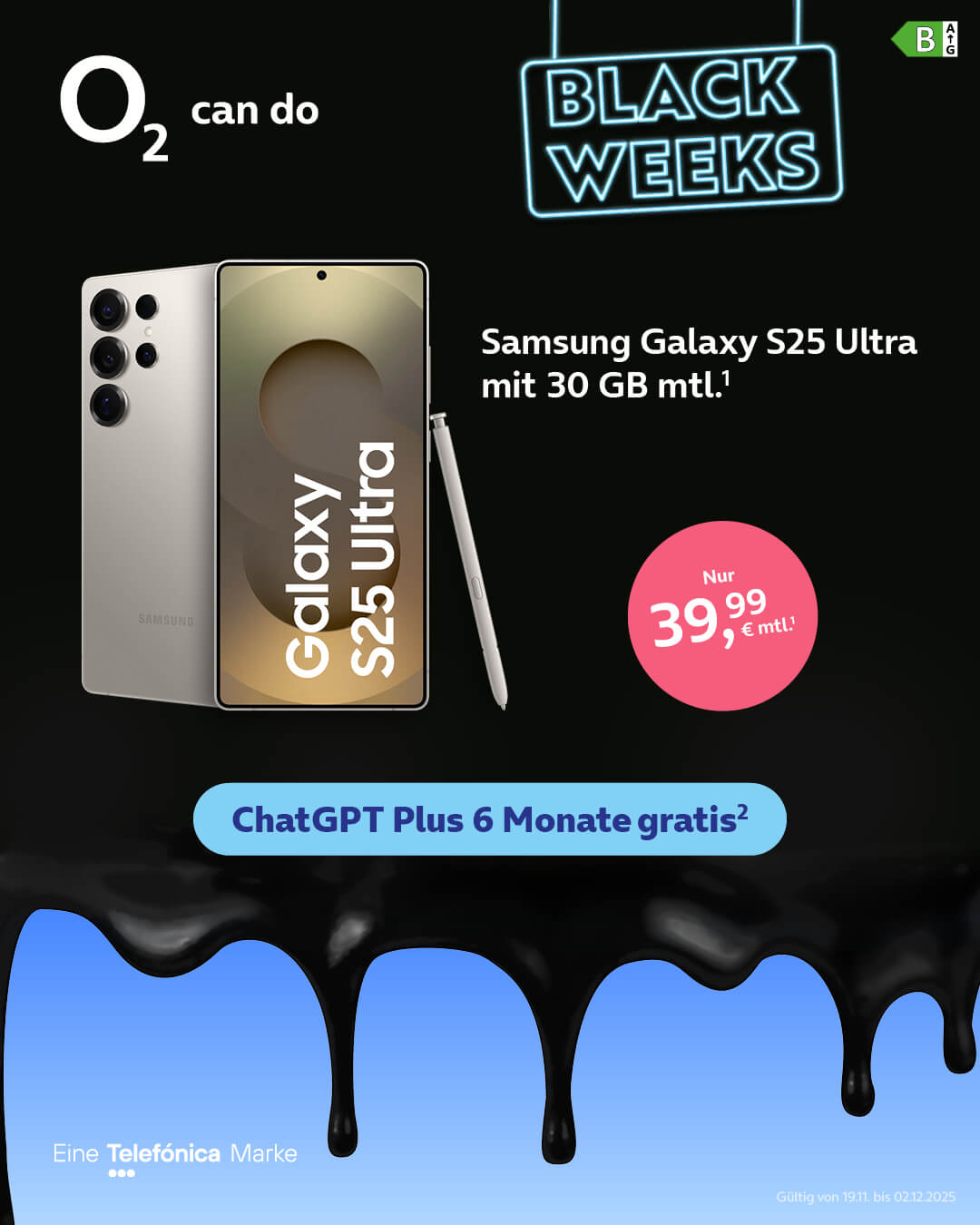 Mit dem Samsung Galaxy S25 Ultra im o2-Tarif mit 30 GB Datenvolumen pro Monat – und einem halben Jahr gratis ChatGPT Plus. 😄